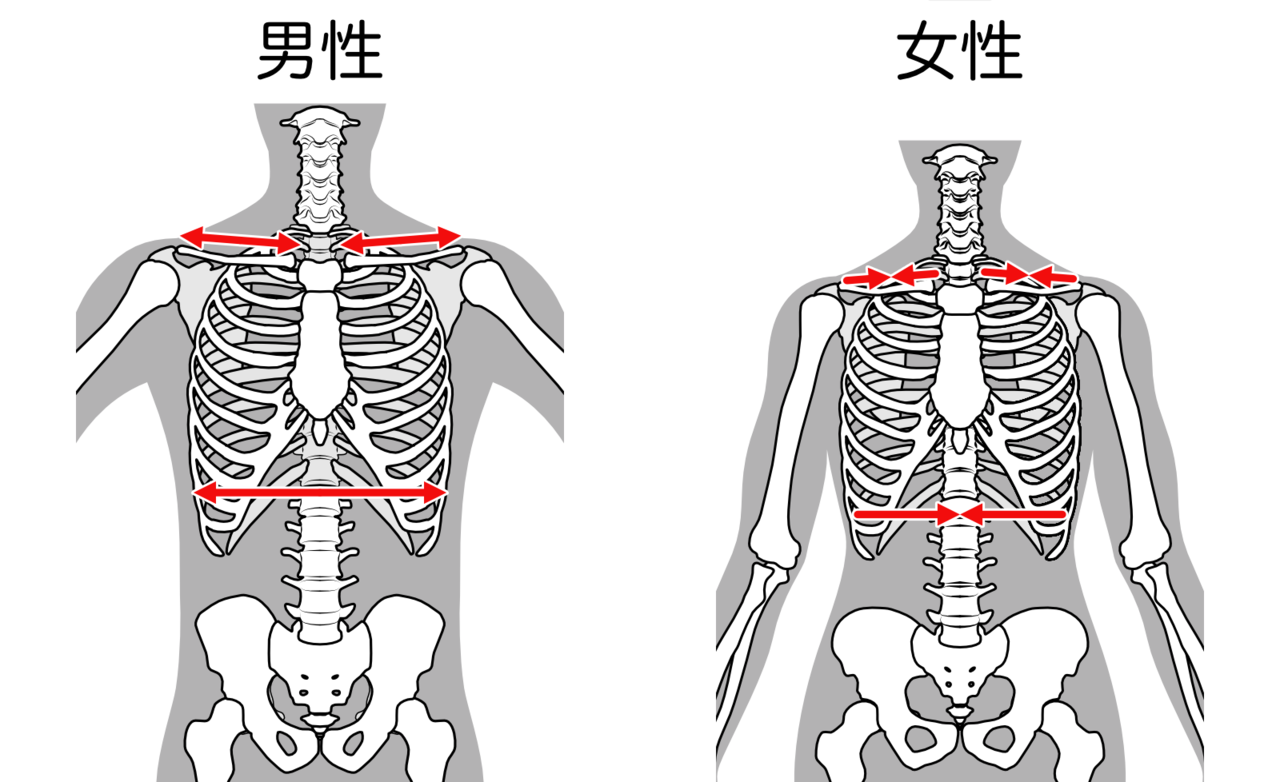 男性の肩幅は広く、肋骨下部は広がった形をして大きいるため、胸部の筋肉や肩まわりに過度な力がかかり、肩こりや背中の不調が出やすくなります。また、骨盤は女性に比べて狭く高い位置にあるため、腰に負担がかかりやすく、長時間座ったり同じ姿勢を取ると、女性と比べて腰痛を引き起こしやすい骨格になっています。